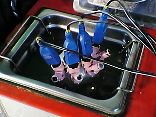 取り外したインジェクターをASNUにて点検洗浄していきます、スプレーパターンや吐出量などを点検していきますが今回明らかに1本吐出量がおかしい為に交換します。