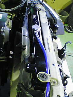 T社さんのオイルクーラーと前置きインタークーラーのKIT取り付けなんですがオイルクーラーの移動エレメント取り付け部分とインタークーラーのパイピングの通る所が一緒です................(T T)