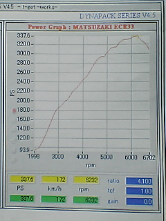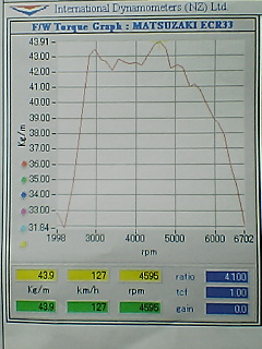 ブースト1.0K時にトルク43.9Kパワー337.6PSでした。R33ブーストアップ最高記録です!