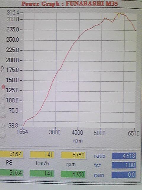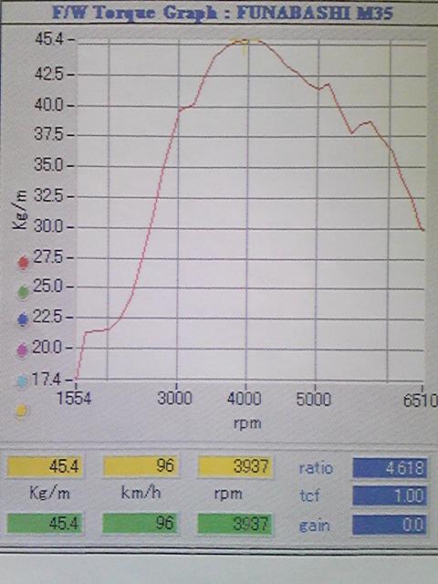 トルク45.4K パワー316.4PS でした!車輌がオートマの為低中速のグラフのラインは走行状態とは異なりますがピークの部分は見れています。