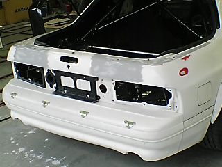 リヤ廻りのアンテナや純正ウイング、後付けのGTウイングのステーなどの穴が開きまくりだった箇所を埋めて修正します。