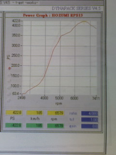 今回のリセッティングではブースト1.3K時に422.8PS 47.9kでした、ピークパワーは若干上がった位ですがレスポンスやアクセルのつきは格段に良くなると思います、フィーリングや水温、油温などの結果についてはまたお知らせします(^^)v