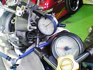 スイングバルブにダイヤルゲージをあてて、スイングバルブの開き始めの圧力をブースト計で確認します。