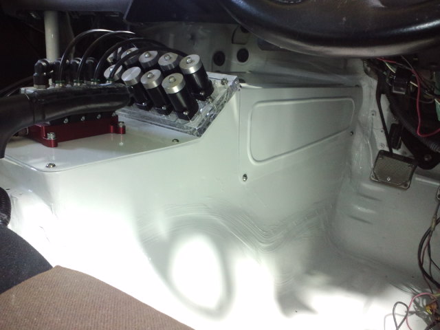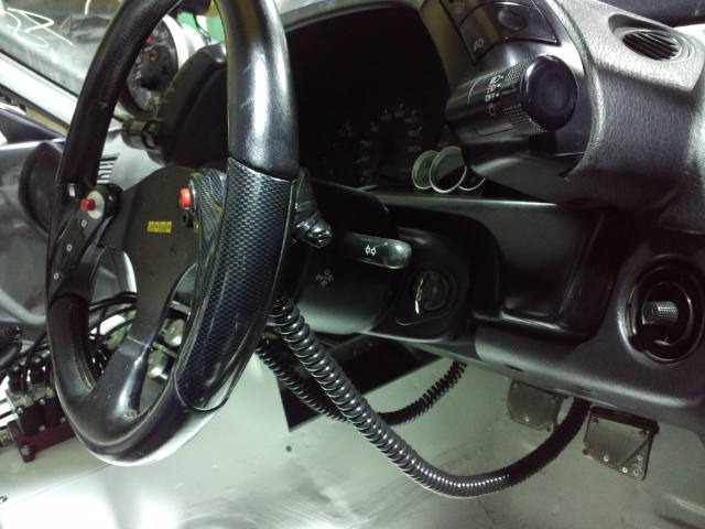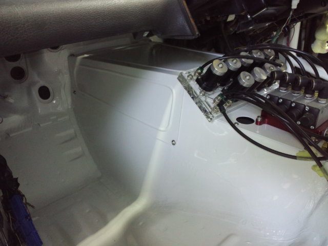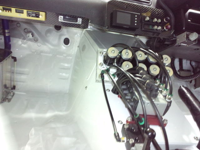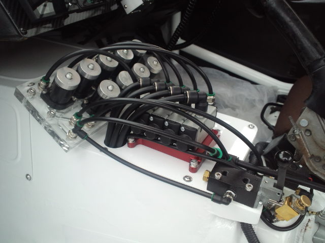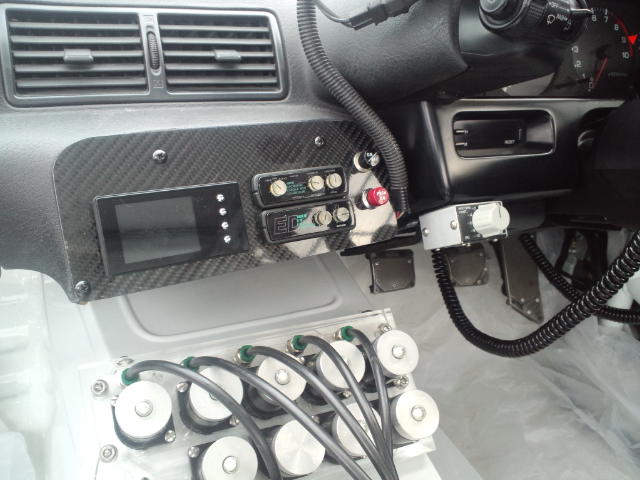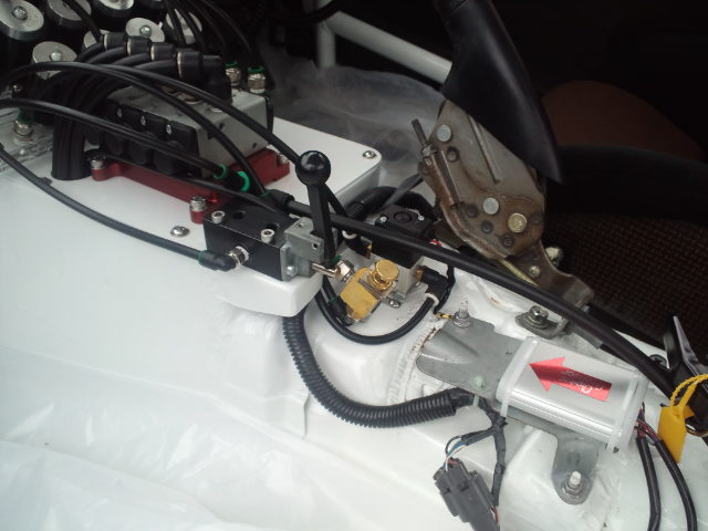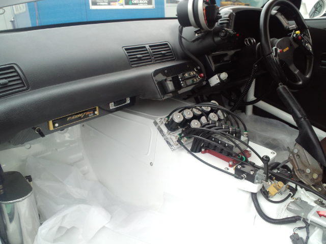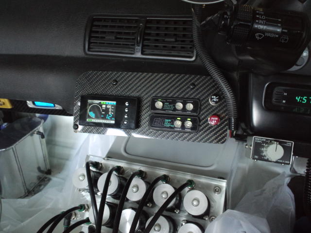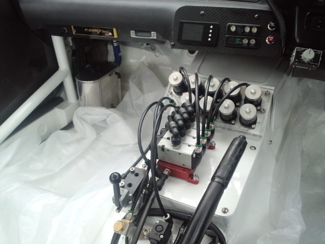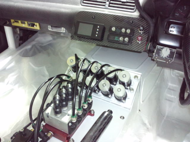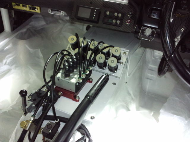 各ソレノイド配管取り廻しを製作した後スイッチ廻りの取り付けですが、シフトスイッチ、ラインロックスイッチ、4WDから2WDへの切り替えスイッチ、プロスタートスイッチ、バックシフトスイッチ、等スイッチだらけになってしまいますので実際の操作のシュミレーションをしながら出来るだけ機能的にレイアウト、取り付けをして見ました!b(^^)