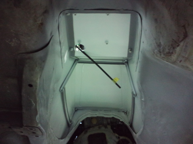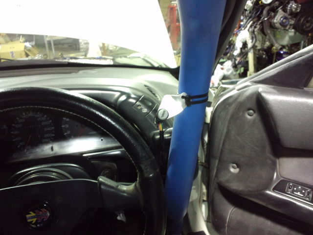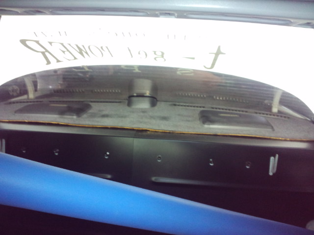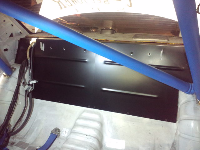 もともとリヤシートを取り外してリヤバルクヘッド部はトランクルームと繋がってしまっていましたので今後のドラッグレースのレギュレーション等も考えドレスアップも兼ねたブラックアルマイト仕様のアルミバルクヘッドカバーを取り付けました!
